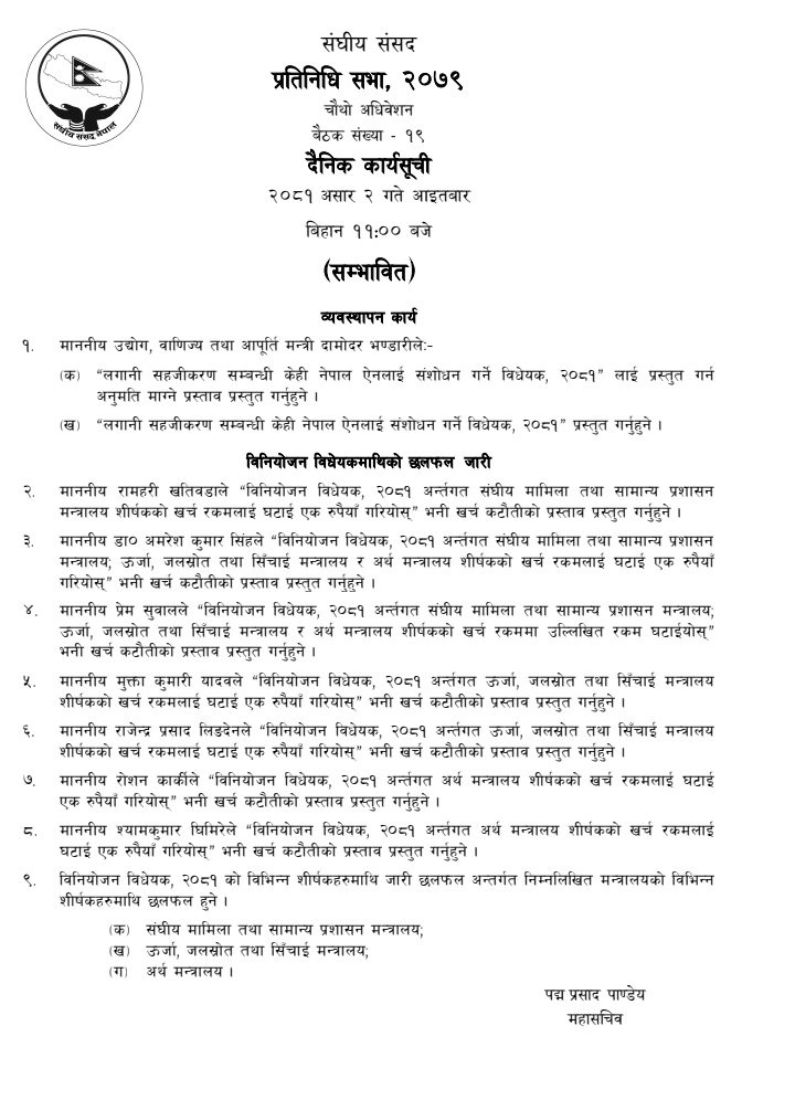 त्यसैगरी बैठकमा उद्योग, वाणिज्य तथा आपूर्ति मन्त्री दामोदर भण्डारीले लगानी सहजीकरणसम्बन्धी केही नेपाल ऐनलाई संशोधन गर्ने विधेयक २०८१ प्रस्तुत गर्ने कार्यसूची रहेको छ । सांसद रामहरि खतिवडाले विनियोजन विधेयक २०८१ अन्तर्गत सङ्घीय मामिला तथा सामान्य प्रशासन मन्त्रालयको शीर्षकको खर्च रकमलाई घटाई एक रुपैयाँ गरियोस् भनी खर्च कटौतीको प्रस्ताव प्रस्तुत गर्ने सम्भावित कार्यसूचीमा उल्लेख छ ।