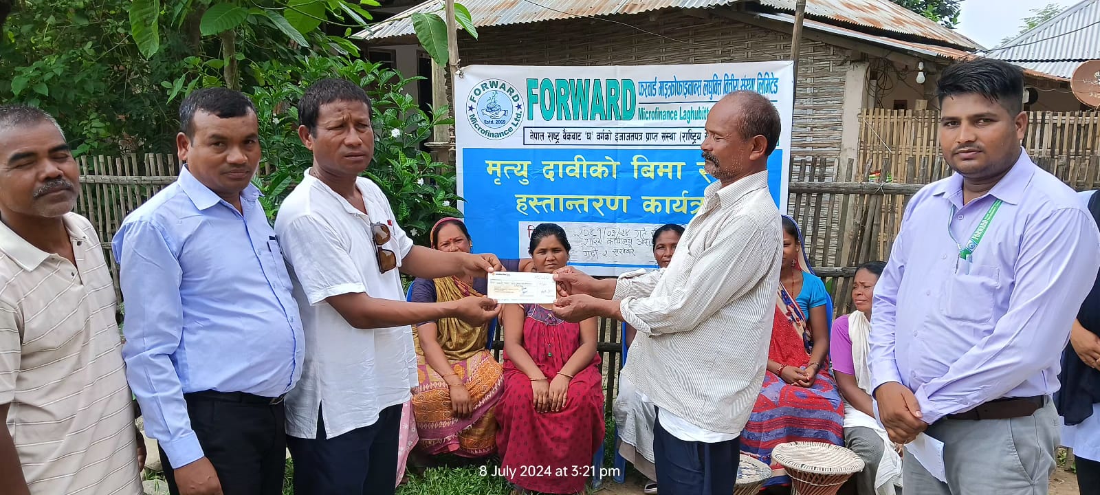 गढी गा।पा। २ सखुवारेकी गितादेवी माझीले २०७९ बैशाख ११ गते संस्थाबाट तीन लाख रुपैंया कर्जा लिएकी थिइन् । उनको कर्जा किस्ता तिर्न बाँकी साँवा र ब्याज रकम एक लाख ४४ हजार रहेकोमा फरवार्डले बाँकी कर्जा किस्ता साँवा र ब्याज रकम कटाई मृत्यु दावी बीमा बापतको ८८ हजार ७ सय ७९ रुपैंया भुक्तान गरेको हो । कर्जा लिने गितादेवीको दुर्घटनामा मृत्यु भएको थियो ।