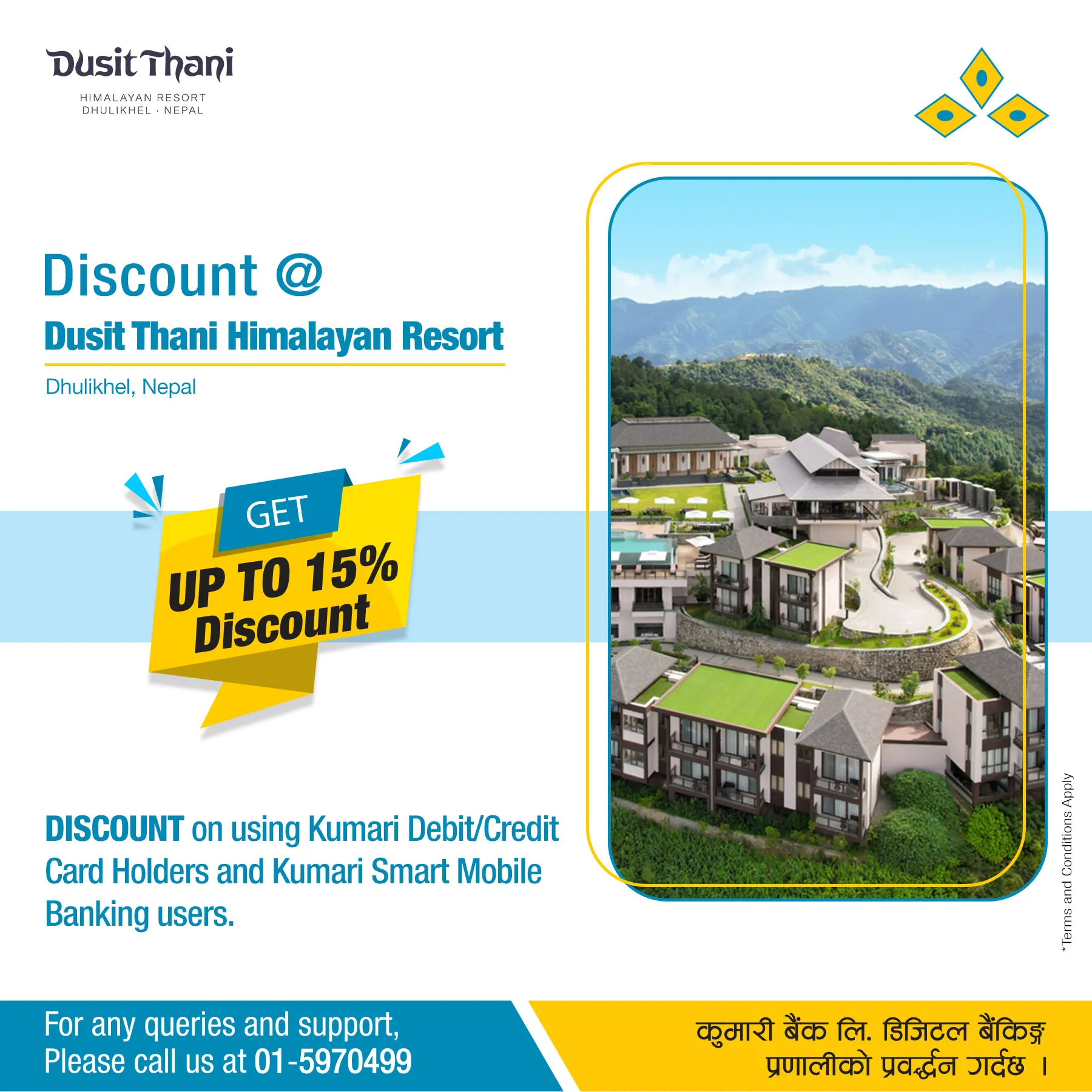 यस सम्झौता अनुसार कुमारी बैंक लिमिटेडका ग्राहक महानुभावहरुले दुसित ठानी हिमालयन रिसोर्टबाट प्रदान गरिने सेवाहरु जस्तै खाना तथा पेय पदार्थ, देवराणा वेलनेस (स्पा), स्वमिङ पूल, ज्याकूजी, स्टीम तथा सोनामा कुमारी बैंकको डेबिट/क्रेडिट कार्ड, मोबाइल बैकिङ्ग सेवाबाट रकम भुक्तानी गर्दा १५ प्रतिशत छुट प्राप्त गर्न सक्नेछन् ।