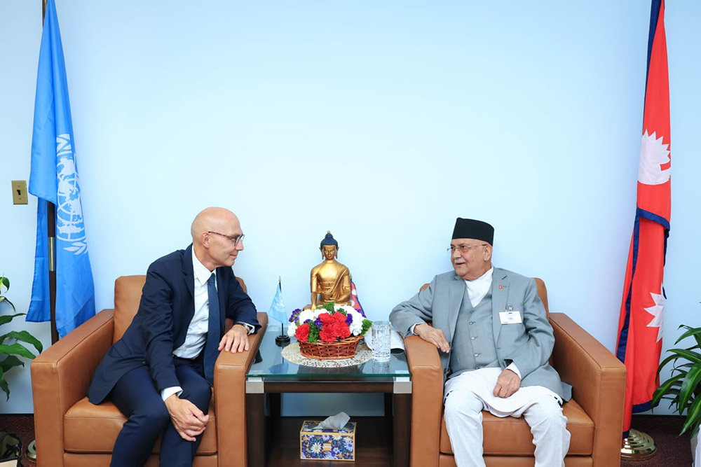 न्युयोर्क । प्रधानमन्त्री केपी शर्मा ओली र राष्ट्रसङ्घका लागि नेपालको स्थायी नियोगको कार्यालय, न्युयोर्कमा राष्ट्रसङ्घका मानव अधिकार उच्चायुक्त भोल्कर टर्कबीच भेटवार्ता भएको छ ।