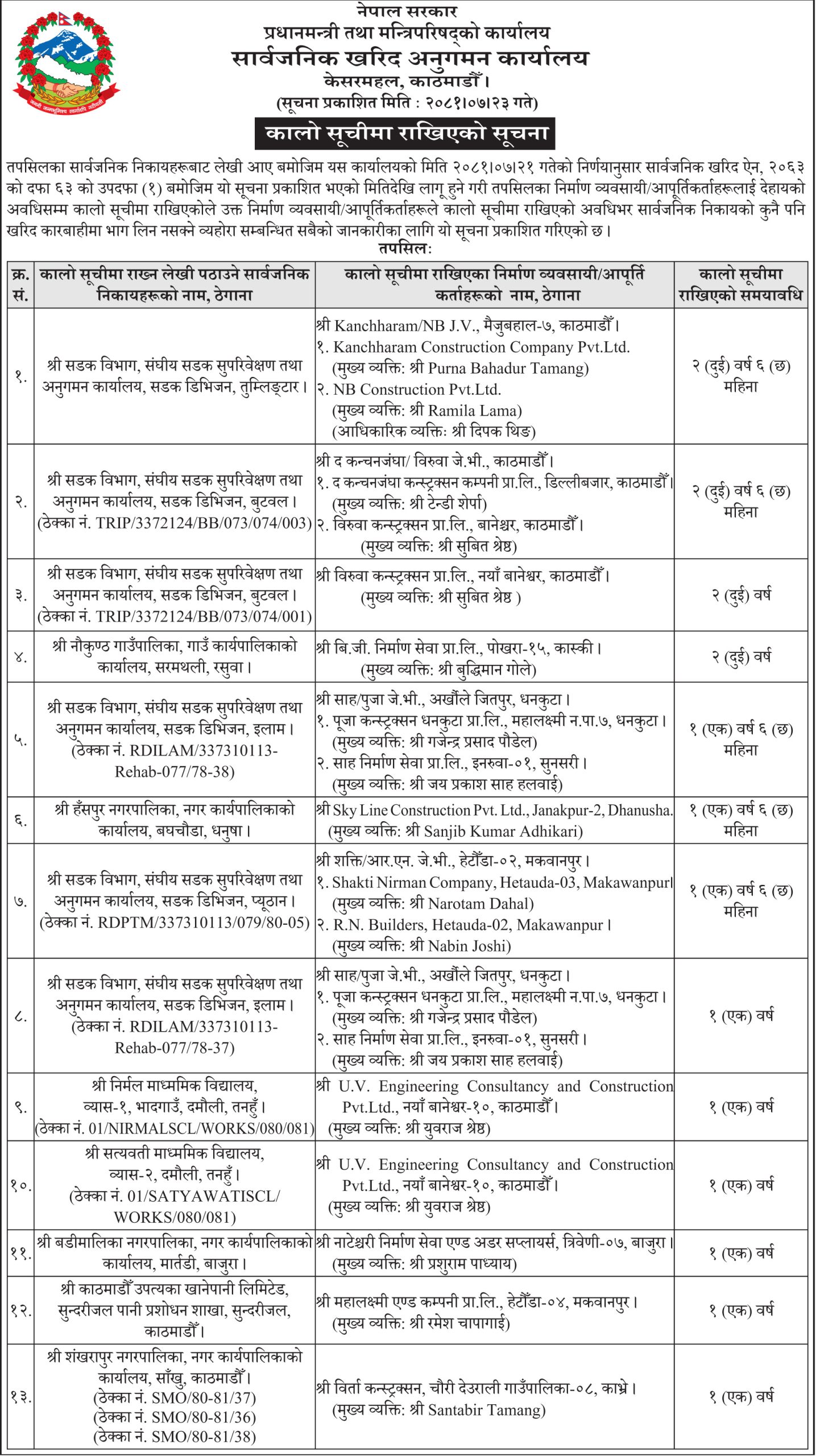 त्यस्तै, कार्यालयले ४ वटा ठेकेदार कम्पनीलाई साढे दुई वर्ष, २ वटा कम्पनीलाई दुई वर्ष, ५ वटा कम्पनीलाई साढे १ वर्ष र ७ वटा कम्पनीलाई १ वर्षका लागि कालोसूचीमा राखेको छ।
