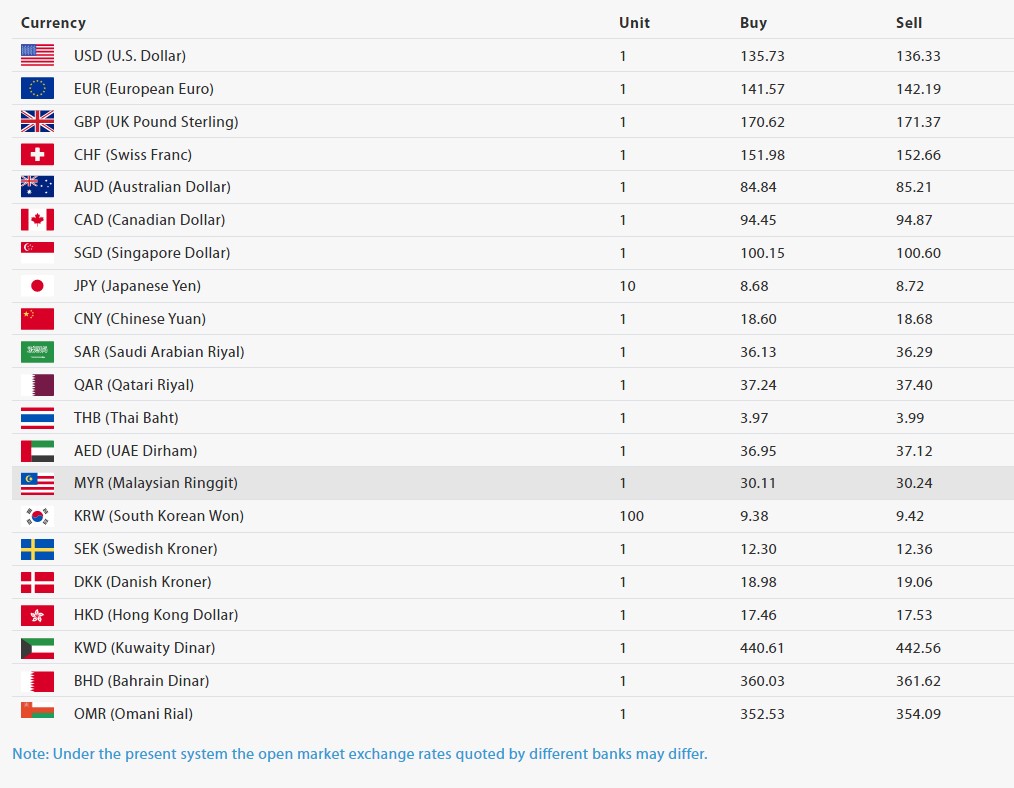 काठमाडौं । नेपाल राष्ट्र बैंकले आजका लागि विदेशी मुद्राको विनिमय दर सार्वजनिक गरेको छ । राष्ट्र बैंकले आज अमेरिकी डलरको खरिददर १३५.७३ रुपैयाँ र बिक्रीदर १३६.३३ रुपैयाँ तोकिएको छ।