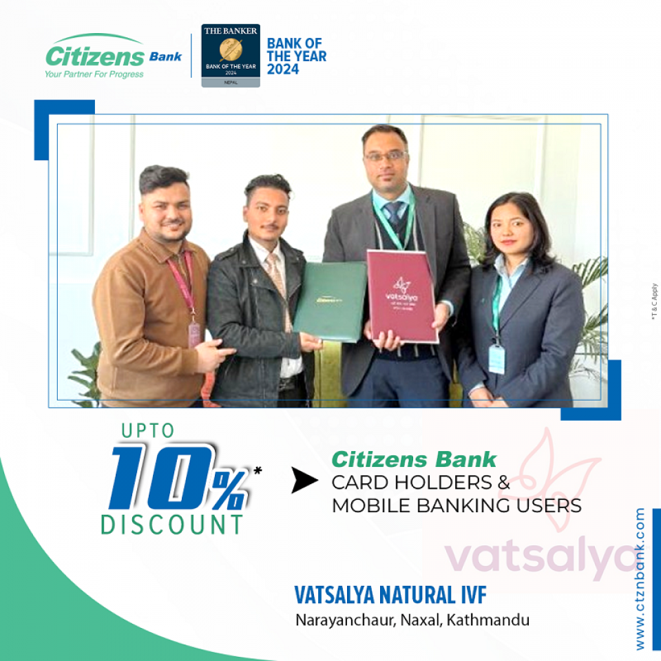 सो समझदारीपत्रमा हस्ताक्षर पश्चात सिटिजन्स बैंकका कार्डबाहक र मोबाइल बैंकिङ ग्राहकहरूले वात्सल्य नेचुरल आईभीएफमा १० प्रतिशतसम्मको आकर्षक छुट पाउनेछन् । यस किसिमको सहकार्यबाट बैंकका ग्राहकहरु लाभान्वित हुनुका साथै नगद कारोबारबाट डिजिटल कारोबार तर्फ उत्प्रेरित हुने विश्वास बैंकले लिएको छ ।