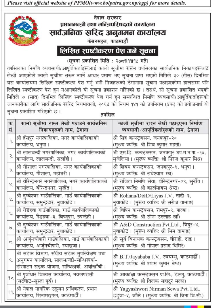 काठमाडौं । प्रधानमन्त्री कार्यालय मातहतको सार्वजनिक खरिद अनुगमन कार्यालयले काम सन्तोषजनक नभएका ११ निर्माण कम्पनीलाई सातदिने स्पष्टीकरण सोधेको छ ।