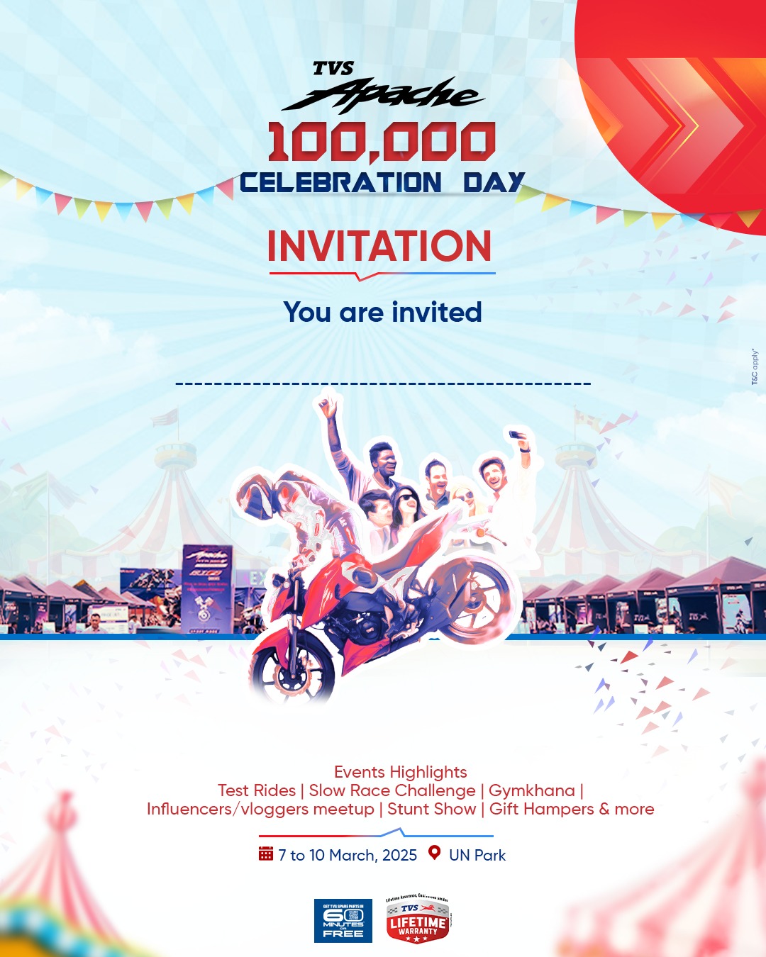 नेपालमा आफ्नो प्रभावशाली उपस्थितिलाई थप बलियो बनाउँदै, टीभीएस अपाचेले १ लाख सेलिब्रेशन डेका रुपमा समेत कार्यक्रमको भव्य आयोजन गर्दैछ । नेपालभर १ लाखभन्दा बढी अपाचे राइडरहरू रहेको उत्सव, अपाचे कम्युनिटीलाई समर्पित गरिने कम्पनीले जानकारी दिएको छ ।