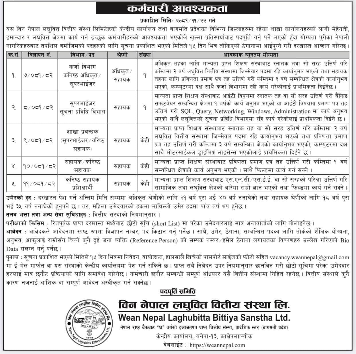 काठमाडाैं। विन नेपाल लघुवित्त वित्तीय संस्थाले विभिन्न पदमा कर्मचारी माग गरेको छ। कम्पनीले कर्जा विभागका कनिष्ठ अधिकृत, सुपरभाईजर, सूचना प्रविधि विभागका सुपरभाईजर, शाखा प्रबन्धक, सहायक, कनिष्ठ सहायक र कनिष्ठ सहायक प्रशिक्षार्थीका लागि कर्मचारी मागेको हो।