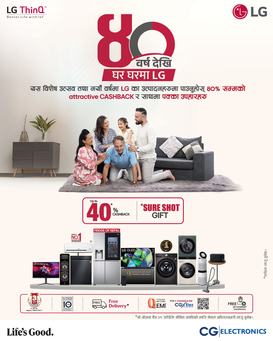 सिजी इलेक्ट्रोनिक्सका मार्केटिङ् तथा कम्युकेसन हेड गौरव हमालले भने, ४ दशकसम्म हामीमाथि भरोसा गरेका सम्पूर्ण नेपाली परिवारप्रति हाम्रो कृतज्ञता प्रकट गर्न नयाँ वर्षको अवसर पारेर यस योजना ल्याइएको हो।भविष्यमा पनि नवीन प्रविधि र भरपर्दो सेवामार्फत उपभाेक्ताहरू संगकाे सम्बन्धलाई अझ मजबुत बनाउन यो योजना एल.जी शोरूम, अधिकारिक डिलर र सि.जी डिजिटल का सम्पूर्ण शाखाहरूमा लागु हुने कम्पनीले जनाएको छ। यो योजना चैत्र २१ गतेदेखि सीमित अवधिको लागि नेपाल अधिराज्यभरी लागु हुनेछ ।