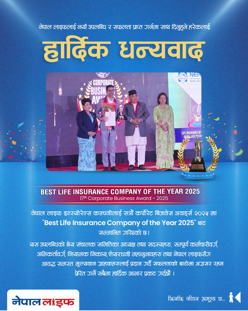 कम्पनीका प्रमुख कार्यकारी अधिकृत प्रवीण रमण पराजुलीले अवार्डबाट सम्मानित भएको सुखद अवसरमा सफलताको श्रेय संचालक समितिका अध्यक्ष तथा सदस्यहरु,सम्पूर्ण कर्मचारीवर्ग, अभिकर्तावर्ग, नियामक निकाय, सेयरधनीहरु तथा नेपाल लाइफसँग आवद्ध समस्त मूल्यवान ग्राहकहरुलाई प्रदान गर्दै सफलताको बाटोमा अग्रसर रहन प्रेरित गर्ने सबैमा हार्दिक आभार प्रकट गरेका छन् ।