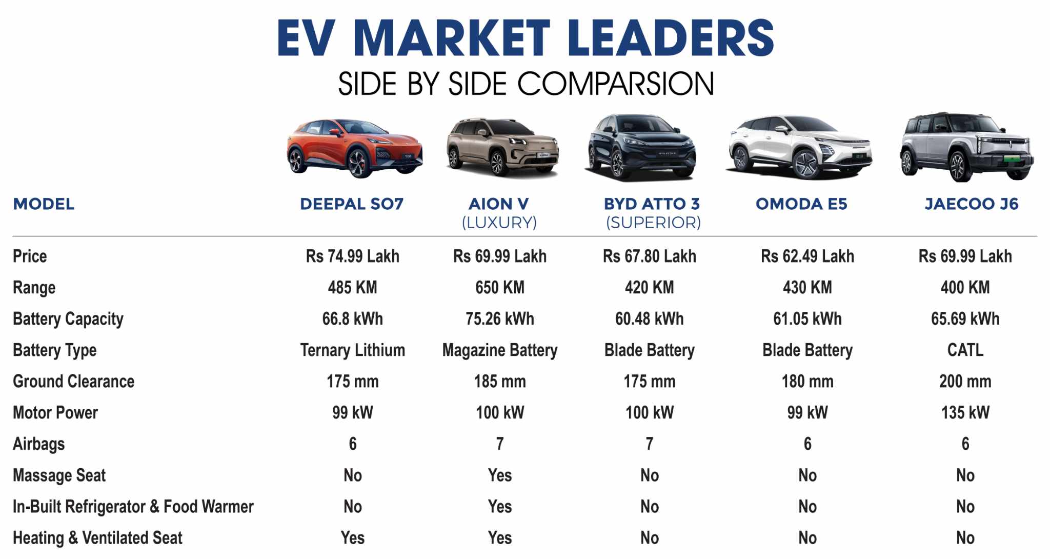 Deepal S07 मा ६ एयरब्याग, १२ इंटेलिजेन्ट ड्राइभिङ फिचर्स, हिटेड र भेन्टिलेटेड सिटहरू छन्, तर NPR ७४.९९ लाख मूल्यमा पनि यसमा मसाज सिट र इन-बिल्ट फ्रिज जस्ता लक्जरी फिचर छैनन्। BYD Atto 3 मा पनि यी सुविधा छैनन्। तर Aion V मा ६५० किमीको रेन्ज, ७ एयरब्याग, १५ इंटेलिजेन्ट ड्राइभिङ फिचर्स, र मसाज सिट तथा इन-बिल्ट फ्रिजजस्ता उच्चस्तरका सुविधाहरू छन्।