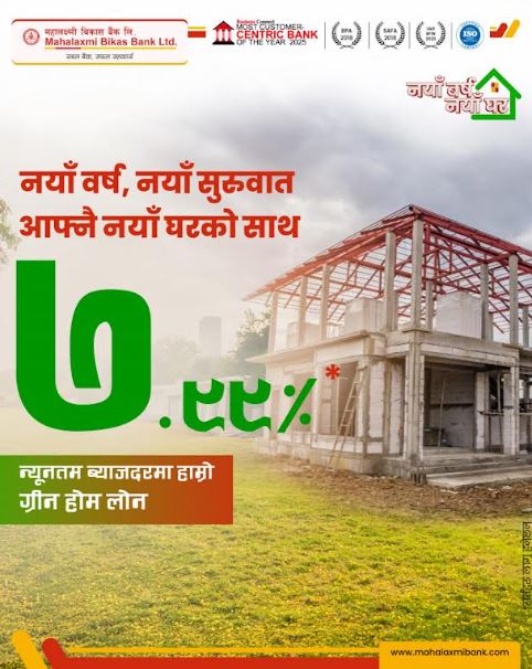 काठमाडौं । महालक्ष्मी विकास बैंकले नयाँ वर्ष २०८२ को उपलक्ष्यमा ग्राहकहरूलाई लक्षित गर्दै ‘महालक्ष्मी घर कर्जा’ एकल अंकको आकर्षक ब्याजदर ७.९९ प्रतिशतमै प्रदान गर्ने घोषणा गरेको छ।