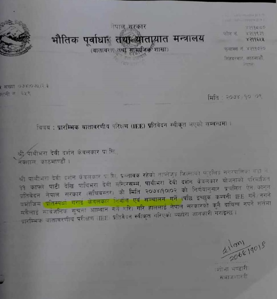 मिति २०७४/१०/०२ मा पाथीभरा देवी दर्शन केवलकार प्रालिको योजनाको प्रारम्भिक प्रतिवेदन नेपाल सरकार सचिव स्तरीय निर्णयानुसार प्रचलित ऐन कानून बमोजिम प्रतिस्पधर्धा गराई केबलकार निर्माण एवं सञ्चालन गर्ने (पछि इच्छुक कम्पनी आईइइ गर्ने या नगर्ने सबैलाई सार्वजनिक सूचना आह्वान गर्ने) गरि हाललाई नेपाल सरकारको कुनै दायित्व नपर्ने शर्तमा पारम्भिक रातावरणीय परीक्षण प्रतिवेदन स्वीकृत गरिएको व्यहोरा जानकारी गराएकाले यो पूर्णरुपमा आवैधानिक रहेको छ ।