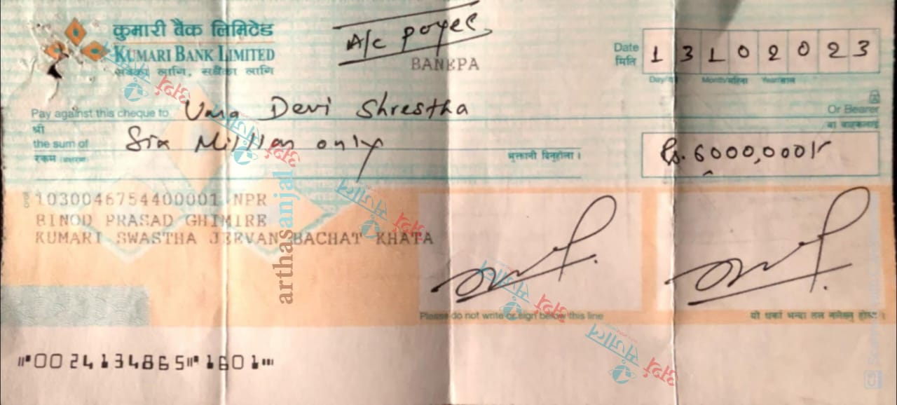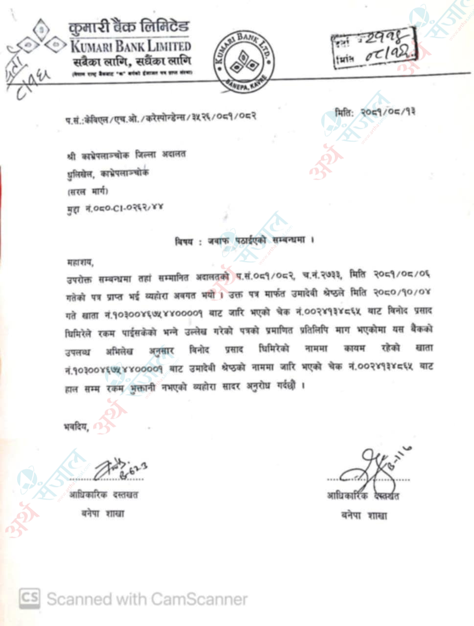 अदालतको बयानमा समेत पैसा दिईसकेको झुटो बयान दिन्छन्। सोहि बयानका आधारमा २०८१ साल मङ्सिर ६ गते काभ्रे जिल्ला आदलतले  बैकको २०२४/०३/२६अर्थात्  २०८० साल चैत १३ को चेक रिटर्न शिटमा चेक नं. ००२४१३४८६५ खाता नं. १०३००४६७५४४००००१ को चेक उमादेवी श्रेष्ठलाई फिर्ता दिईएको भनी Received by Umabevi Shrestha भन्ने उल्लेख भएको देखिदा उक्त रकम उमादेवी श्रेष्ठले बुझेको हो होईन स्पष्ट खुलाई पठाईदिन भन्दै  कुमारी  बैंकलाई  पत्र काट्छ।