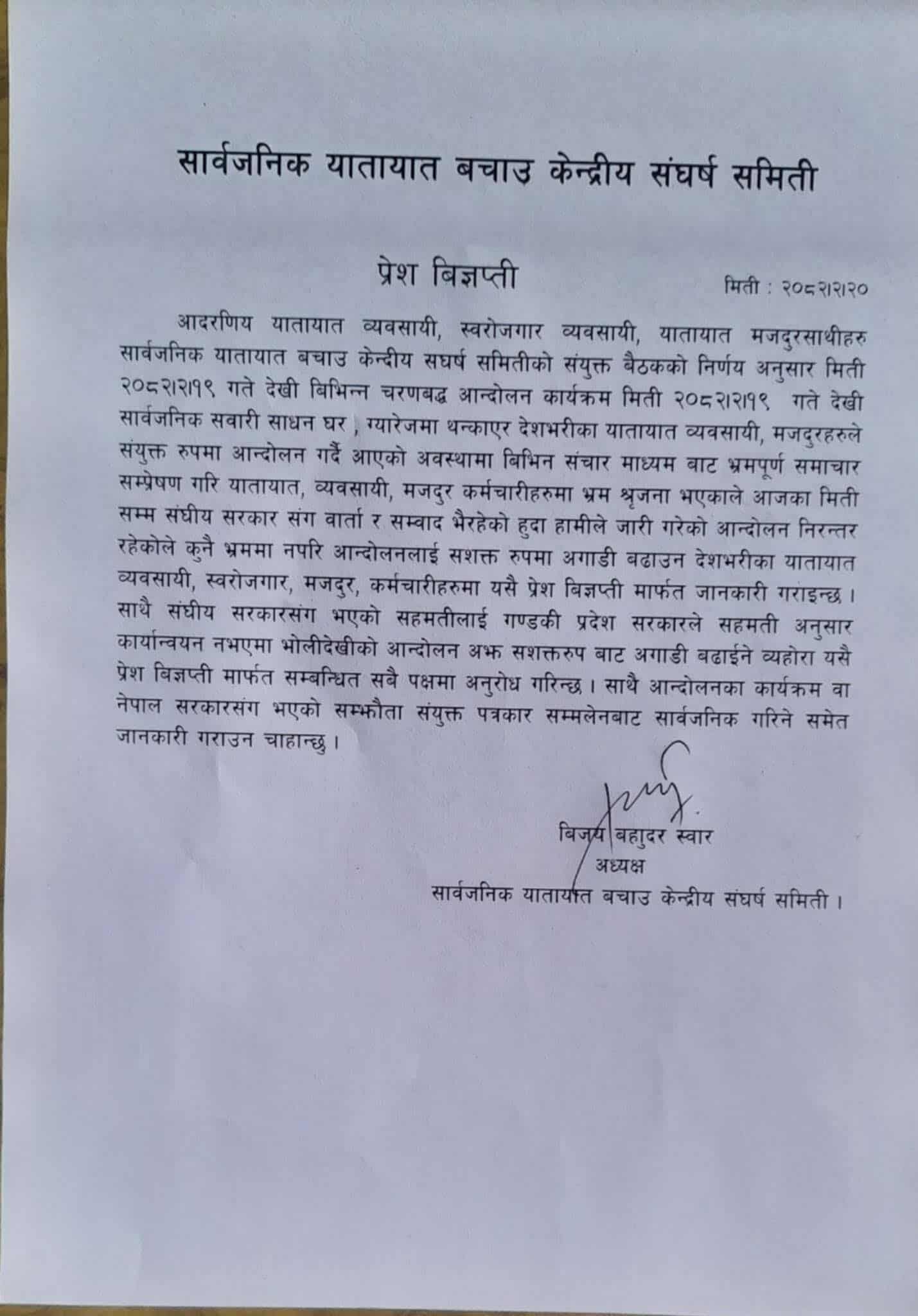 सार्वजनिक यातायात बचाउ केन्द्रीय संघर्ष समितिका अध्यक्ष विजय बहादुर स्वारले एक विज्ञप्ति जारी गर्दै सरकारसँग वार्ता जारी रहेकोले आफूहरूको आन्दोलन सशक्त रुपमा अघि बढाउन देशभरका यातायात व्यवसायी, स्वरोजगार, मजदुर, कर्मचारीहरूमा आग्रह गरेका छन् ।