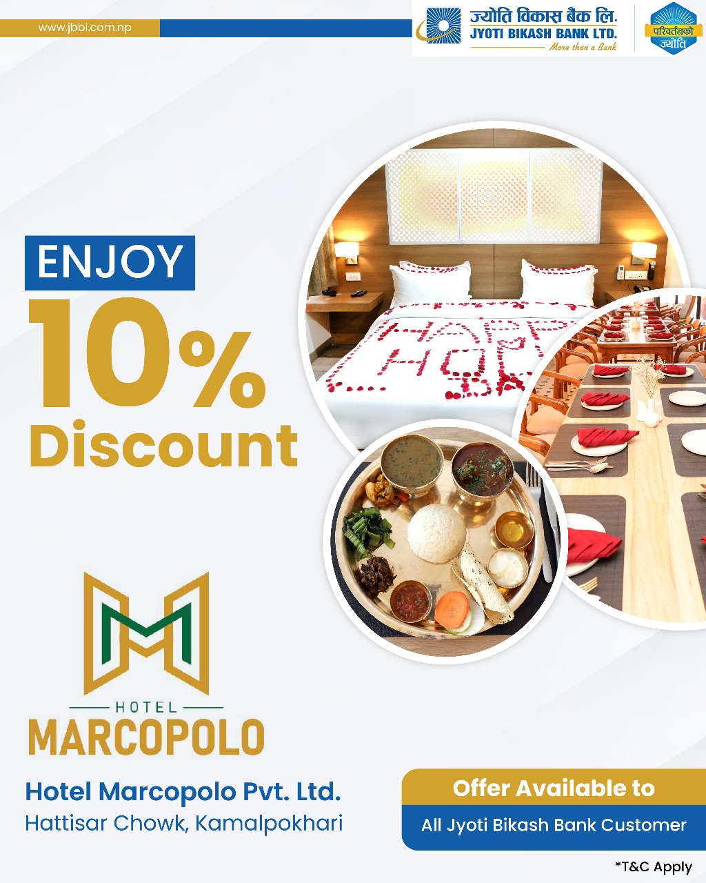 काठमाडौं । ज्योति विकास बैंकले काठमाडौंको हात्तीसारस्थित ‘होटेल मार्कोपोलो’मा बैंकका ग्राहकहरूलाई १० प्रतिशतसम्मको विशेष छुट प्रदान गर्ने सम्बन्धी सम्झौता गरेको छ ।