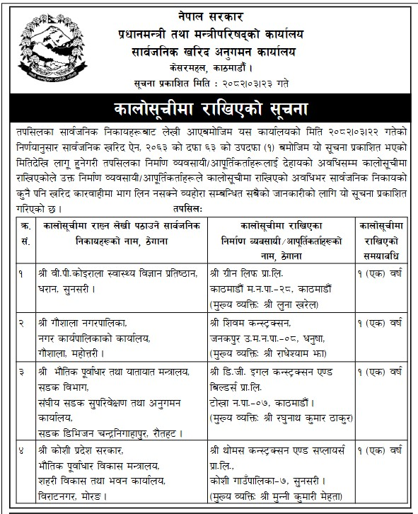 ग्रिन लिफ प्रा.लि काठमाडौं, श्री शिवम कन्ट्रक्सन जनकपुर, डि.जी इगल कन्ट्रक्सन एण्ड विल्डर्स प्रा.लि टोखा र थोमस कन्ट्रक्सन एण्ड सप्लायर्सलाई सार्वजनिक खरिद ऐन– २०६३ को दफा ६३ को उपदफा (१) बमोजिम कालो सूचीमा राखिएको सूचनामा उल्लेख छ ।