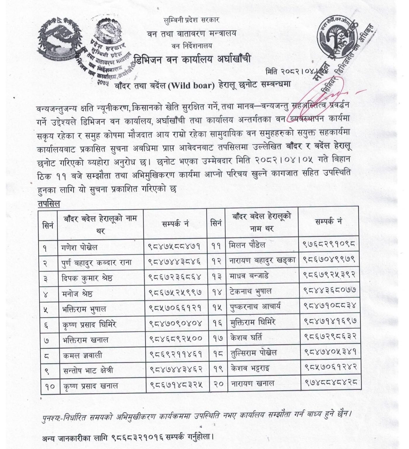 अर्घाखाँची । अर्घाखाँचीमा बालीनालीकाे रेखदेख गर्न डिभिजन वन कार्यालयले बाँदर र बँदेल हेरालु नियुक्त गरेको छ । कार्यालयले आज एक सूचना प्रकाशित गरी छनोट भएका २० जना व्यक्तिहरूको नामावली सार्वजनिक गर्दै सम्झौताका लागि आह्वान गरेको छ।