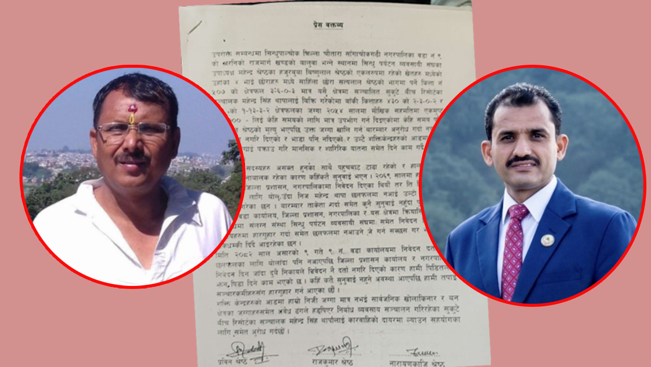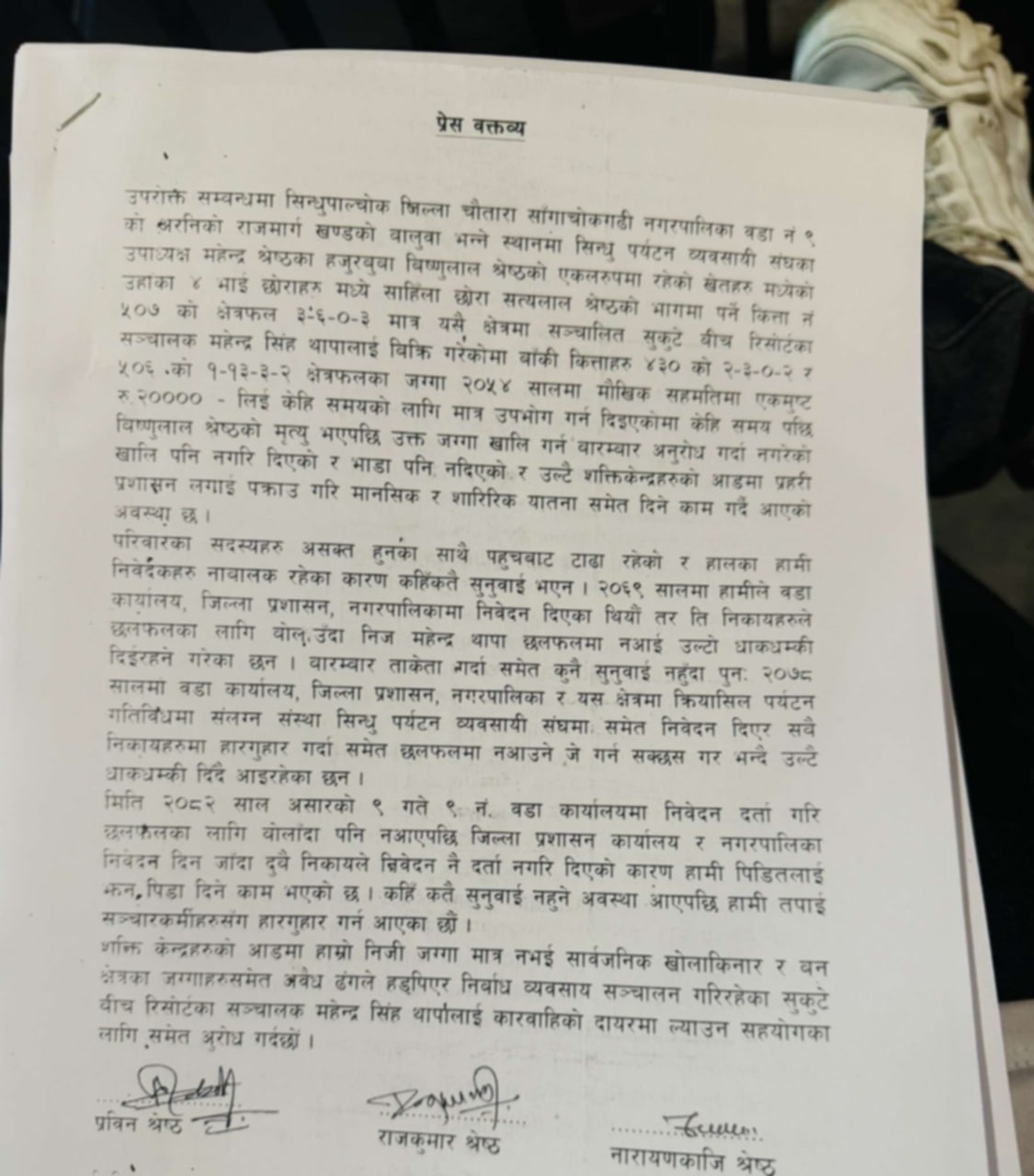 ‘सिन्धुपाल्चोक जिल्ला चौतारा साँगाचोकगढी नगरपालिका– ९ को अरनिको राजमार्गखण्डको बालुवा भन्ने स्थानमा सिन्धु पर्यटन व्यवसायी संघका उपाध्यक्ष महेन्द्र श्रेष्ठका हजुरबुबा विष्णुलाल श्रेष्ठको एकल रूपमा रहेको खेत उनका चार भाइ छोराहरूमध्ये साहिँला छोरा सत्यलाल श्रेष्ठको भागमा पर्ने कित्ता नं. ५०७ को क्षेत्रफल ३–६–०–३ मात्र यसै क्षेत्रमा सञ्चालित सुकुटे बीच रिसोर्टका सञ्चालक महेन्द्रसिंह थापालाई बिक्री गरे,’ श्रेष्ठले जारी गरेको प्रेस विज्ञप्तिमा भनिएको छ, ‘बाँकी कित्ताहरू ४३० को २–३–०–२ र ५०६ को १–१३–३–२ क्षेत्रफलका जग्गा ०५४ सालमा मौखिक सहमतिमा एकमुस्ट २० हजार लिई केही समयका लागि मात्र उपभोग गर्न दिइएकोमा केही समयपछि विष्णुलाल श्रेष्ठको मृत्यु भएपछि उक्त जग्गा खाली गर्न बारम्बार अनुरोध गर्दा खाली पनि नगरिदिएको र भाडा पनि नदिएको र उल्टै शक्तिकेन्द्रहरूको आडमा प्रहरी प्रशासन लगाई पक्राउ गरी मानसिक र शारीरिक यातनासमेत दिने काम गर्दै आएको अवस्था छ ।’