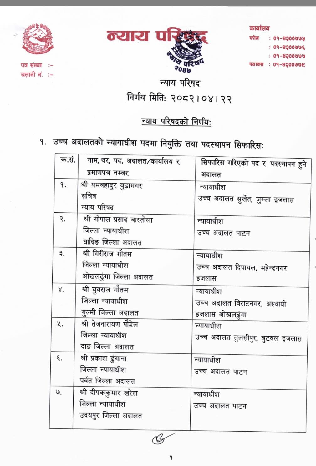 यही साउन २२ गतेको न्याय परिषद् बैठकले उच्च अदालतका लागि २७ न्यायाधीश नियुक्त गरी पदस्थापन गरेको थियो ।