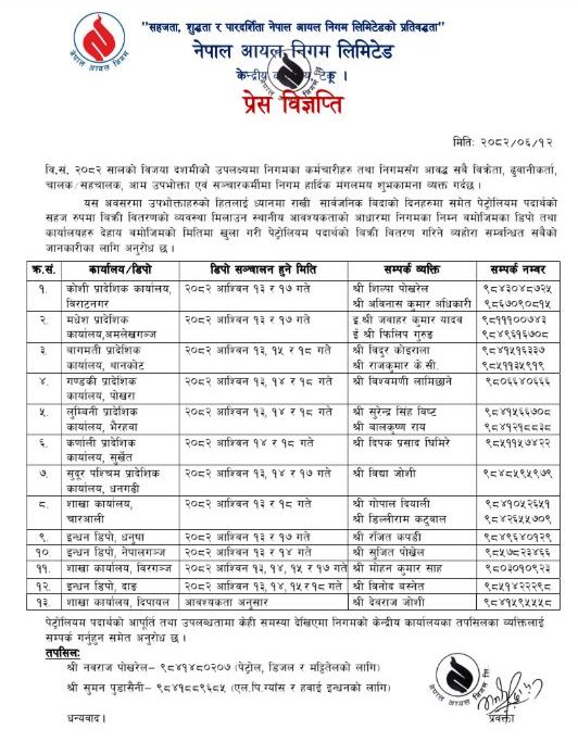 निगमले सम्बन्धित कार्यालयहरू बन्द भएको अवस्थामा पेट्रोलियम व्यवसायी र ढुवानीकर्ताको सहजताको लागि प्रत्येक डिपोको सम्पर्क व्यक्ति तोकेको छ । ती व्यक्तिसँग सम्पर्क गरेर तोकिएको समयमा डिपोबाट पेट्रोलियम पदार्थ दिन सक्ने निगमले जनाएको छ ।