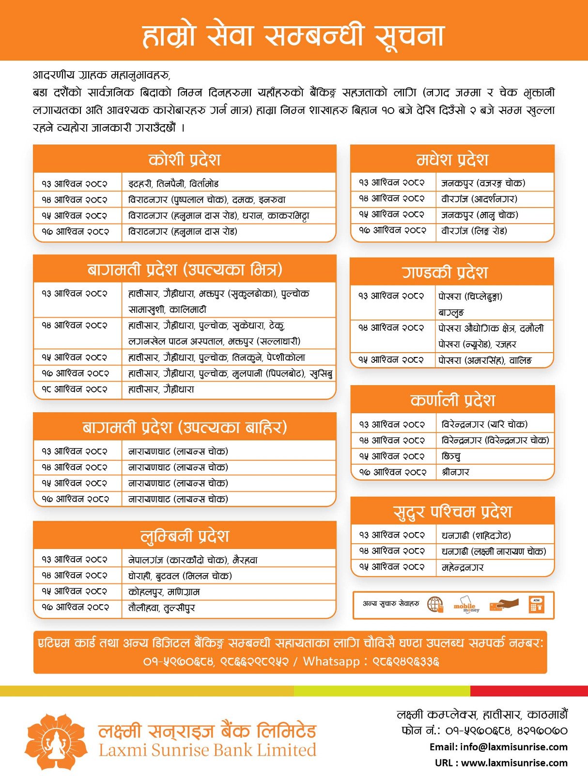 लक्ष्मी सनराइज बैंकले दशैं बिदामा ५२ वटा शाखा कार्यालयहरू खुला राख्ने तालिका बनाएको छ। असोज १३ देखि १७ गतेसम्म कोशी, मधेस, बागमती, गण्डकी, लुम्बिनी, कर्णाली र सुदूरपश्चिम प्रदेशका ग्राहकहरूले नगद कारोबारलगायतका सीमित बैंकिङ सेवा बिहान १० बजेदेखि दिउँसो २ बजेसम्म लिन सक्नेछन्।
