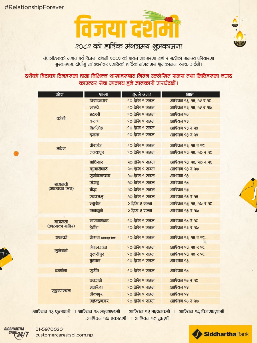 सिद्धार्थ बैंकले दशैंको बिदामा ३१ वटा शाखा कार्यालयहरू सञ्चालन गर्नेछ। कोशी, मधेस, बागमती, गण्डकी, लुम्बिनी, कर्णाली र सुदूरपश्चिम प्रदेशमा रहेका यी शाखाहरू असोज १३ देखि १७ गतेसम्म तोकिएको समयमा (बिहान १० बजेदेखि दिउँसो १ बजेसम्म) नगद कारोबारलगायतका अत्यावश्यक बैंकिङ सेवाका लागि खुला रहनेछन्।