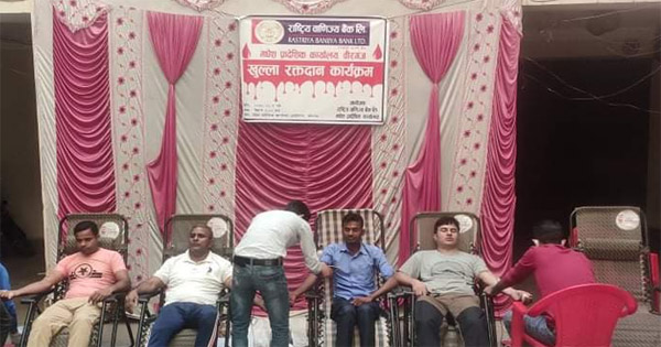 बैंकको मधेश प्रादेशिक कार्यालयको प्रादेशिक प्रबन्धक कमलेश ठाकुरको अध्यक्षतामा संचालन भएको रक्तदान कार्यक्रममा वीरगंज, श्रीपुर शाखाका कर्मचारी तथा आम नागरिकले रक्तदान गर्नुभएको थियो ।