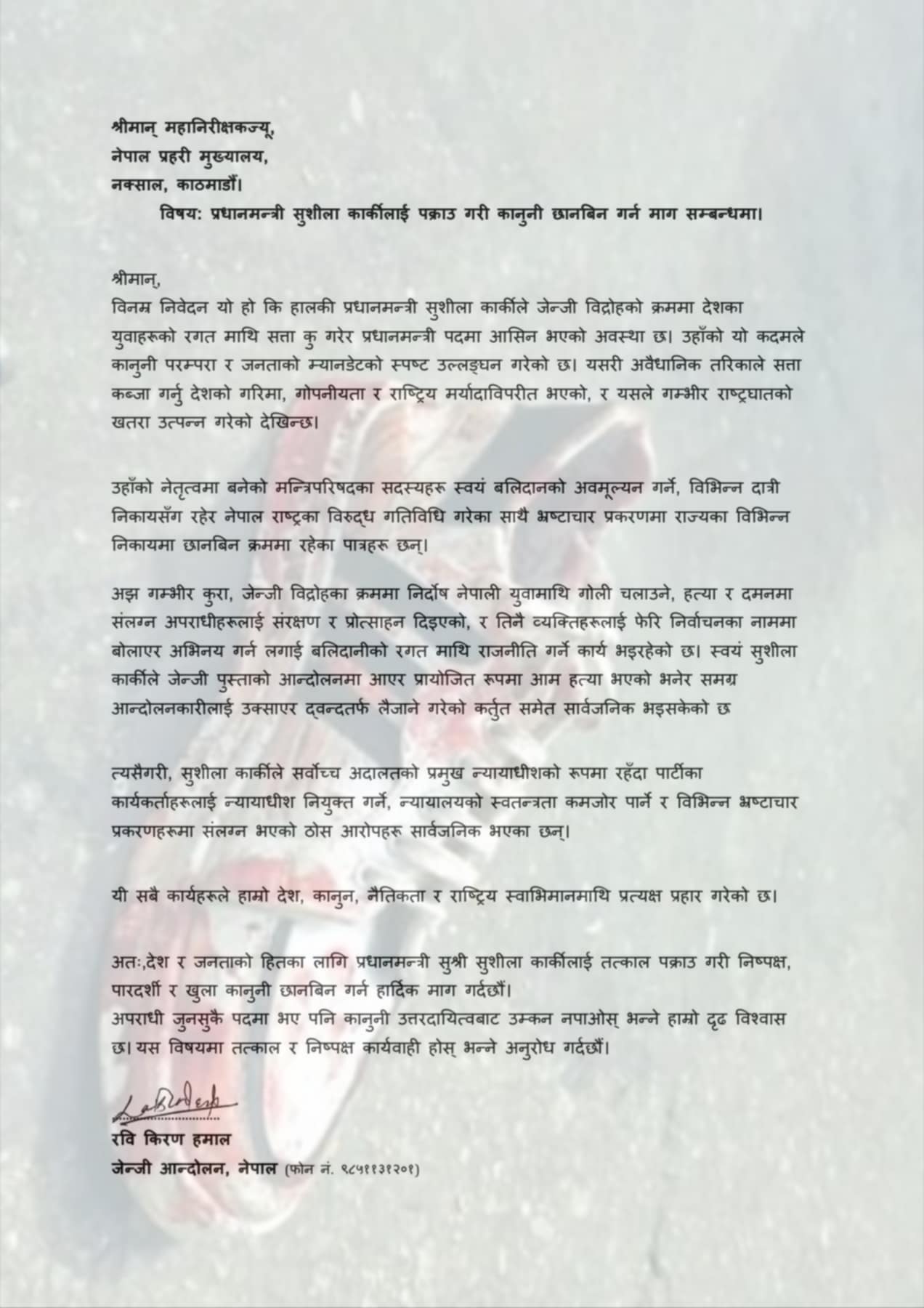प्रधानमन्त्री सुशीला कार्कीको गिरफ्तारी माग गर्दै जेन्जी आन्दोलनको निवेदन