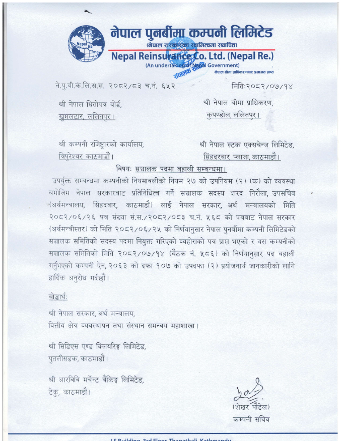 काठमाडौं । नेपाल पुनर्बीमा कम्पनी लिमिटेड (नेपाल रि) को सञ्चालक पदमा अर्थ मन्त्रालयका उपसचिव शरद निरौला नियुक्त भएका छन् ।