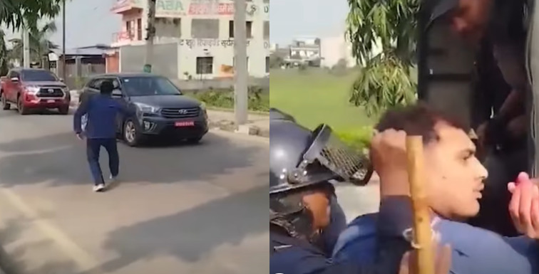 आज बिहान प्रहरी भ्यान पछिपछि गुडिरहेको महेश बस्नेत सवार कारमा युवाहरु सडक किनारबाट दगुर्दै गएर रातो मसी फ्याँकेका थिए ।