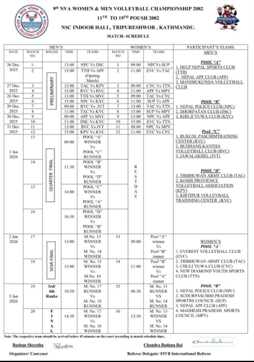 काठमाडौं । पुस ११ गतेदेखि सुरु हुने नवौं एनभीए महिला तथा पुरुष भलिबल च्याम्पियनसिप–२०८२ को खेल तालिका सार्वजनिक भएको छ।
