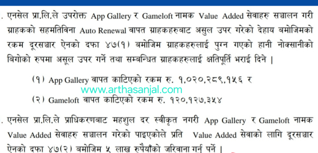 एनसेलले ‘एप ग्यालरी’ र ‘गेमसफ्ट’ नामक सेवा सञ्चालन गर्दै अटो–रिन्युअल प्रणालीमार्फत सेवाग्राहीको जानकारी र स्पष्ट सहमति बिना शुल्क कटौती गरेको प्राधिकरणको ठहर छ ।