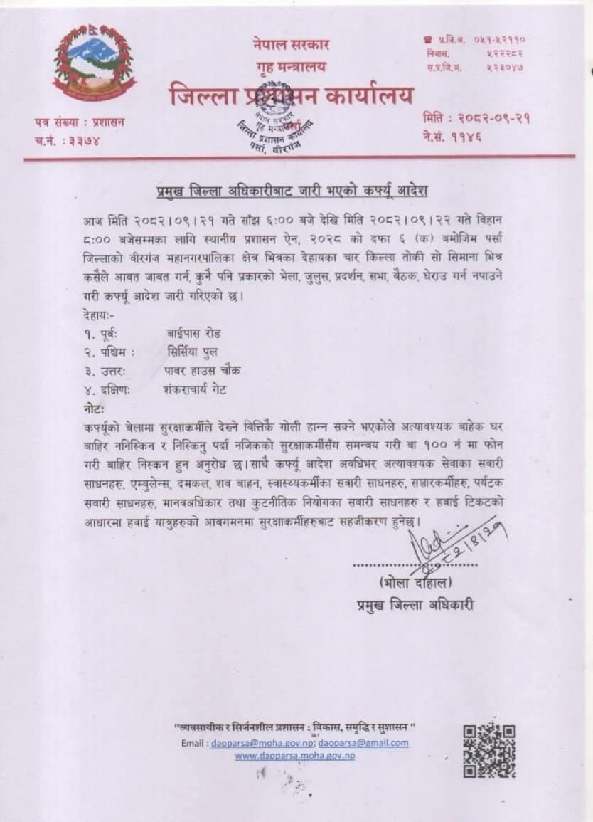 रौतहट। जिल्ला प्रशासन कार्यालय पर्साले वीरगञ्ज महानगरपालिकाका मुख्य क्षेत्रहरूमा कर्फ्यु आदेश जारी गरेको छ ।