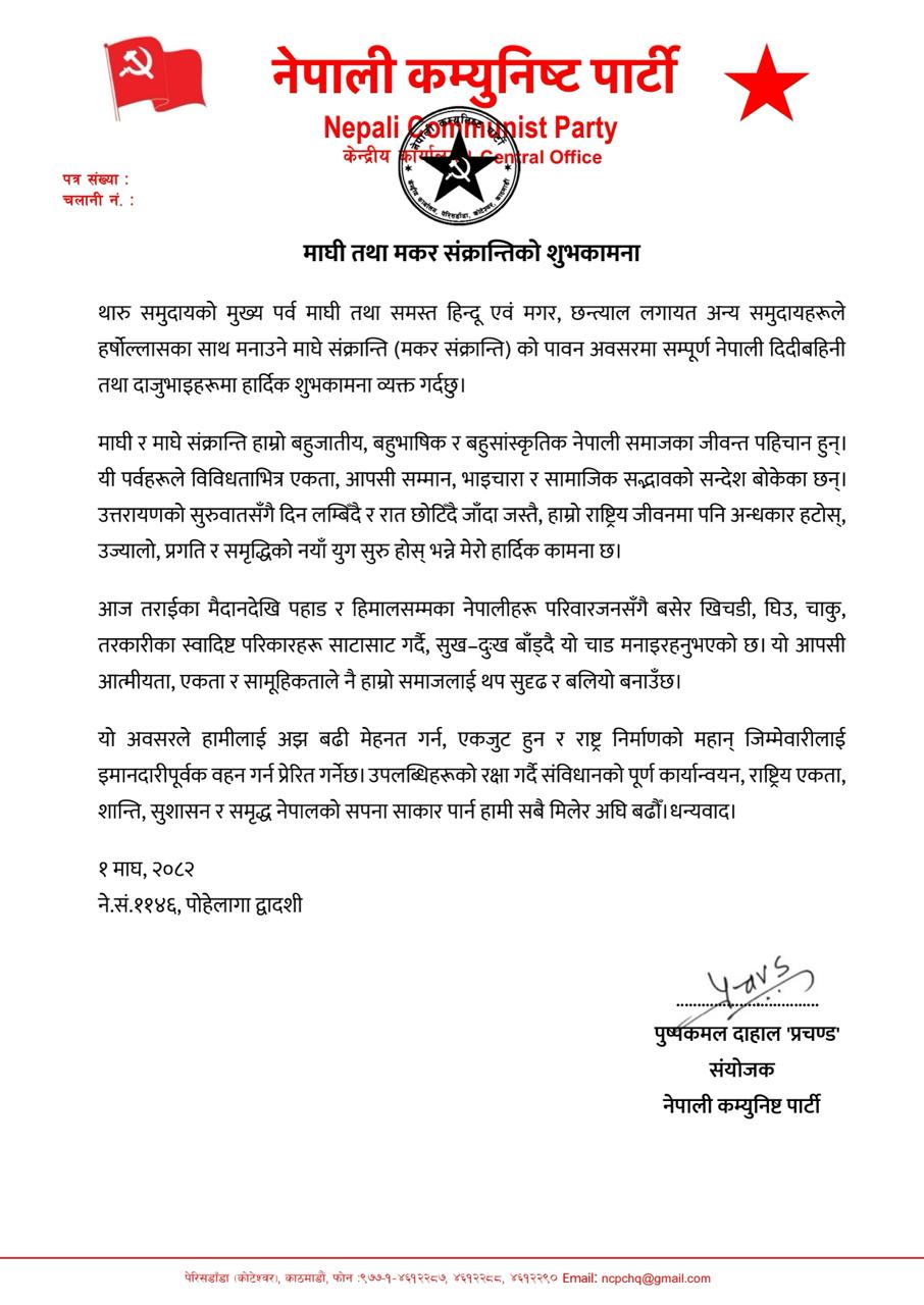 शुभकामना सन्देशमार्फत संयोजक प्रचण्डले माघी र माघे संक्रान्तिलाई नेपालको बहुजातीय, बहुभाषिक र बहुसांस्कृतिक समाजका जीवन्त पहिचानका रूपमा उल्लेख गर्दै यी पर्वहरूले विविधताभित्र एकता, आपसी सम्मान, भाइचारा र सामाजिक सद्भावको सन्देश दिने बताएका छन्।