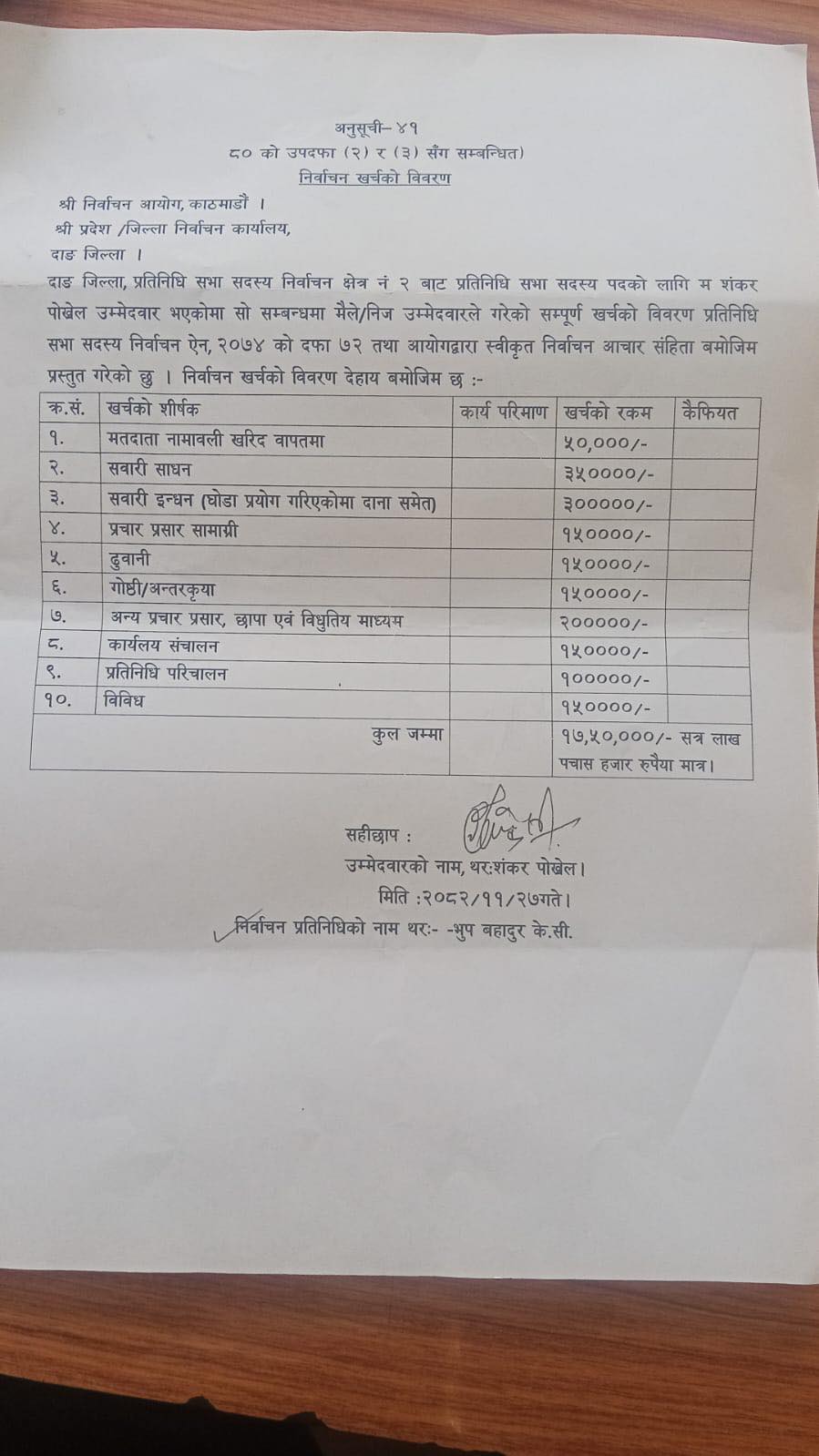 काठमाडौं । नेकपा एमालेका महासचिव एवं दाङ क्षेत्र नम्बर २ का उम्मेदवार शंकर पोखरेलले आफ्नो चुनावी खर्च सार्वजनिक गरेका छन् ।
