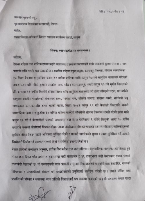 आइतबार स्थानीय महिला समूह बाजुराले प्रमुख जिल्ला अधिकारी डोरेन्द्र निरौलामार्फत गृहमन्त्रीलाई ध्यानाकर्षण पत्र बुझाएका हुन्।तत्काल महिला तथा बालिका माथि हुने हिंसा रोक्न माग समेत गरिएको छ।