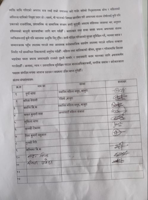 बर्षेनी महिला र बालिका माथि हुने यौनजन्य घटना विकराल बन्दै गएकोले यस्ता घटनाको सत्यतथ्य छानवीन गरि दोषीलाई कडा भन्दा कडा कारवाही गर्न माग समेत गरिएको छ ।