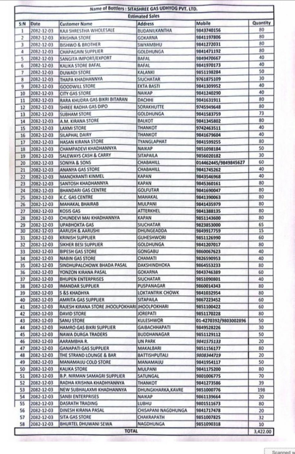 ६) सीताश्री ग्यास ३,४२२ सिलिन्डर