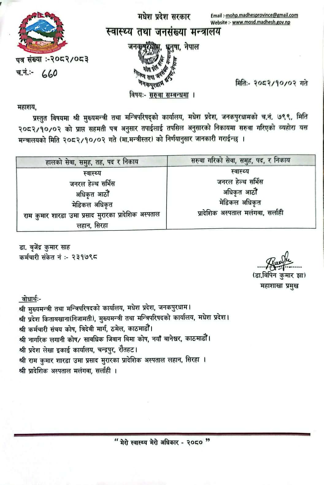 मन्त्रालयको निर्णयअनुसार जनरल हेल्थ सर्भिस अन्तर्गत आठौँ तहका मेडिकल अधिकृत डा. बृजेन्द्र कुमार साह लाई सिराहाको लहानस्थित राम कुमार शारदा उमा प्रसाद मुरारका प्रादेशिक अस्पतालबाट सर्लाहीको प्रादेशिक अस्पताल मलंगवामा सरुवा गरिएको हो ।