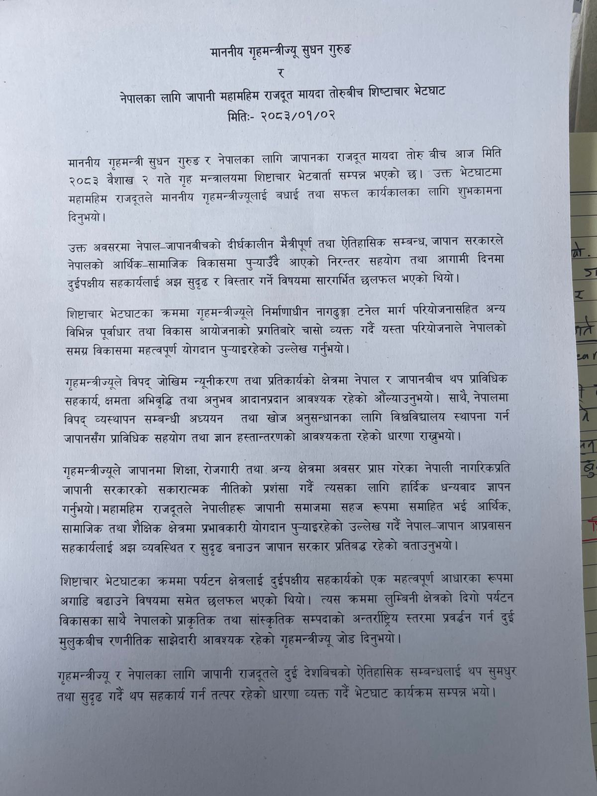 उक्त भेटघाटमा महामहिम राजदूतले गृहमन्त्री गुरुङलाई बधाई तथा सफल कार्यकालको शुभकामना व्यक्त गरेका थिए । साथै, नेपाल–जापानबीचको दीर्घकालीन मैत्रीपूर्ण तथा ऐतिहासिक सम्बन्ध, जापान सरकारद्वारा नेपालको आर्थिक तथा सामाजिक विकासमा पु¥याइँदै आएको सहयोग र आगामी दिनमा दुईपक्षीय सहकार्यलाई अझ सुदृढ बनाउने विषयमा सारगर्भित छलफल भएको थियो।