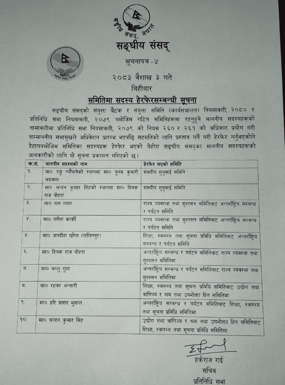 दीपकराज बोहरालाई अन्तर्राष्ट्रिय सम्बन्ध र पर्यटन समितिबाट राज्य व्यवस्था तथा सुशासन समितिमा, बब्लु गुप्ता अन्तर्राष्ट्रिय सम्बन्ध र पर्यटन समितिबाट राज्य व्यवस्था तथा सुशासन समितिमा ल्याइएको छ ।