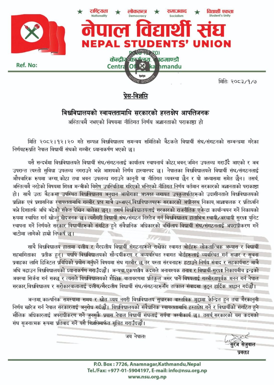 काठमाडौं । नेपाल विद्यार्थी संघले विश्वविद्यालयको स्वायत्ततामाथि सरकारको हस्तक्षेप भएको आरोप लगाएको छ । प्रवक्ता सुरज सेजुवालले विज्ञप्ति जारी गर्दै अस्तित्वमै नभएको विषयमा नीतिगत निर्णय गर्नु अज्ञानताको पराकाष्ठा भएको बताएका छन् ।