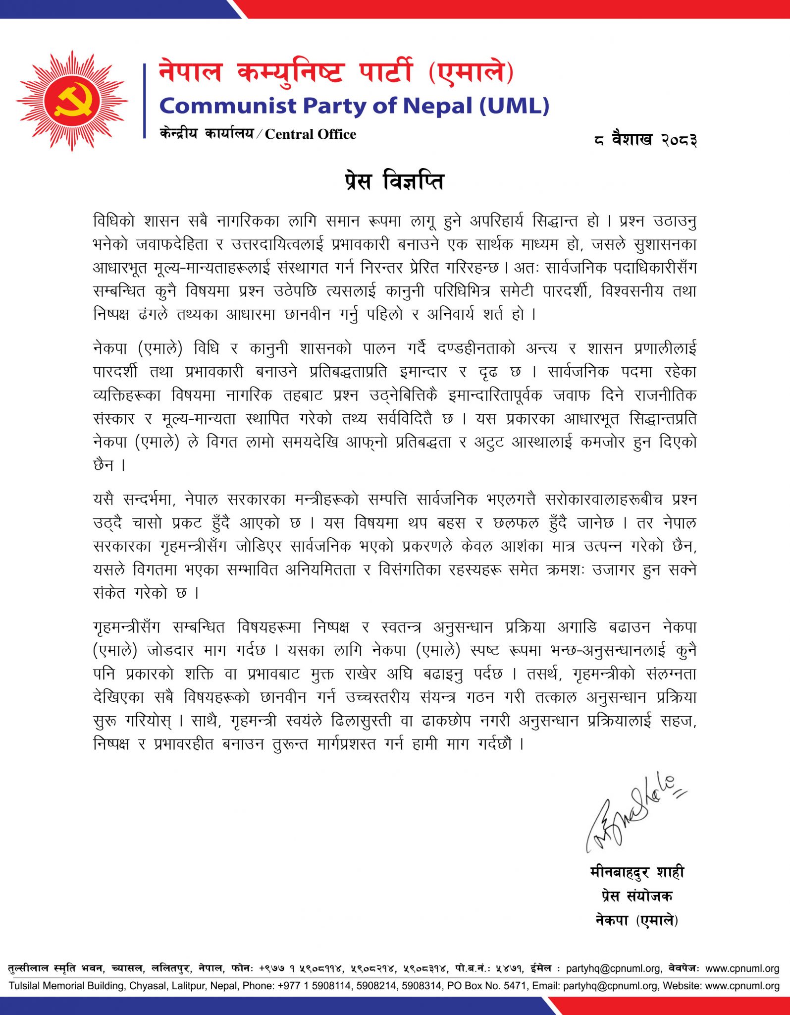 एमालेले सरकारका मन्त्रीहरूको सम्पत्ति सार्वजनिक भए लगत्तै गृहमन्त्रीसँग जोडिएर सार्वजनिक भएको प्रकरणले सम्भावित अनियमितता र विसङ्गतिका रहस्यहरू समेत क्रमशः उजागर हुन सक्ने सङ्केत गरेको जनाएको छ ।