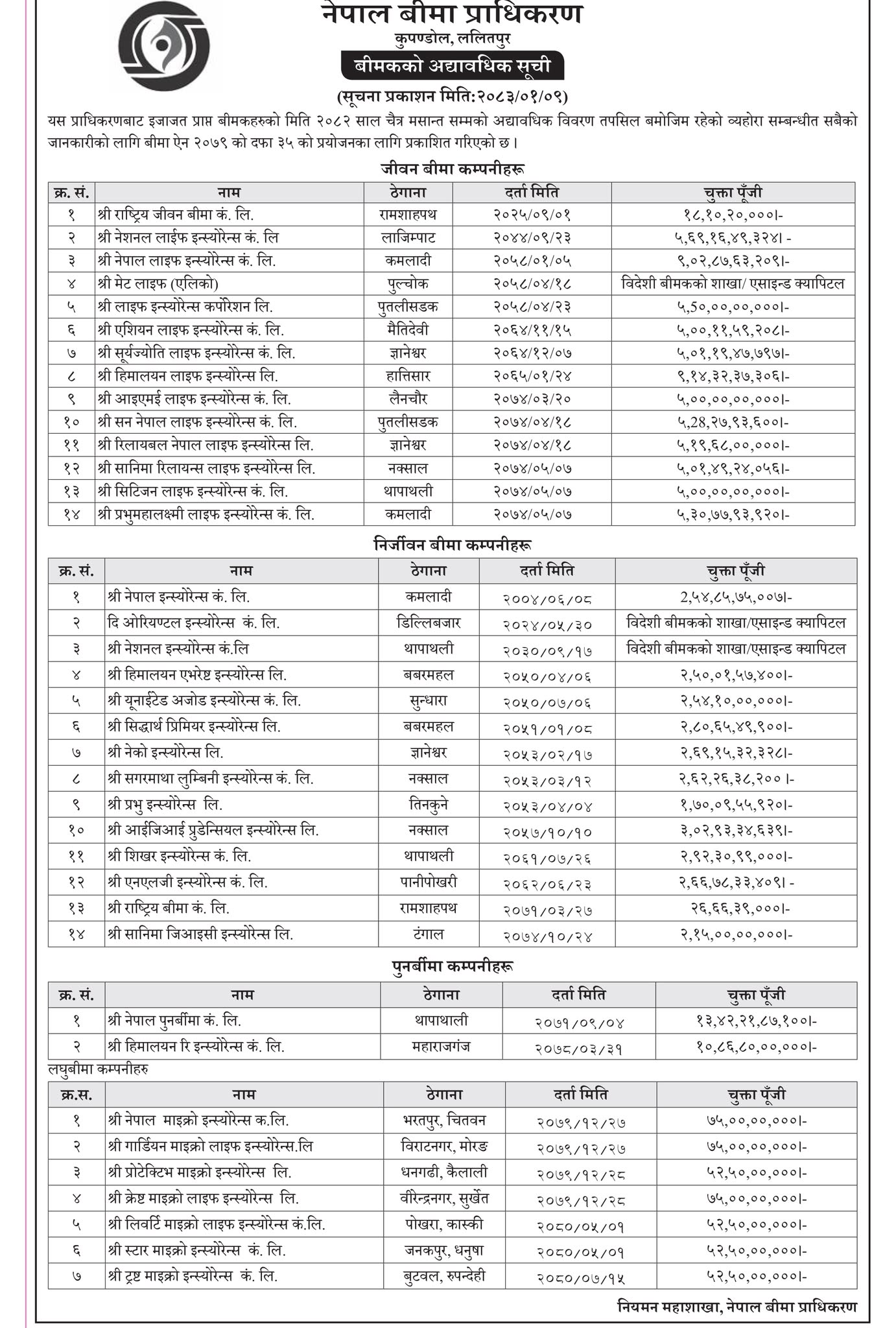 ३७ बीमा कम्पनीको अद्यावधिक विवरण सार्वजनिक, कसको चुक्तापुँजी कति?