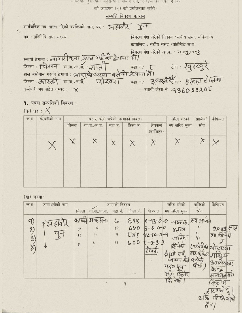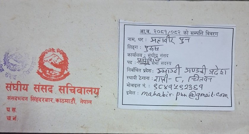 काठमाडौँ । सांसद महावीर पुनले बुधवार सामाजिक सञ्जालमार्फत सम्पत्ति विवरण सार्वजनिक गरेका छन् ।
