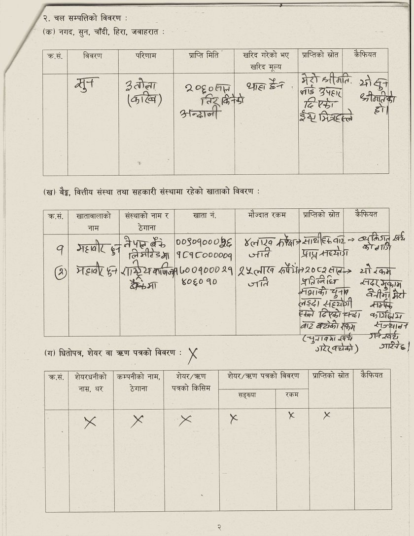 साथै, उनले नेपाल बैंक लिमिटेडमा चार लाख रुपैयाँ नगद रहेको, राष्ट्रिय वाणिज्य बैंकमा २५ लाख रहेको खुलाएका छन् । उक्त रकम चुनावी चन्दा भनेका छन् । कास्कीमा विभिन्न कित्तामा करिब २७ रोपनी, १५ आना चार पैसा रहेको उल्लेख छ ।