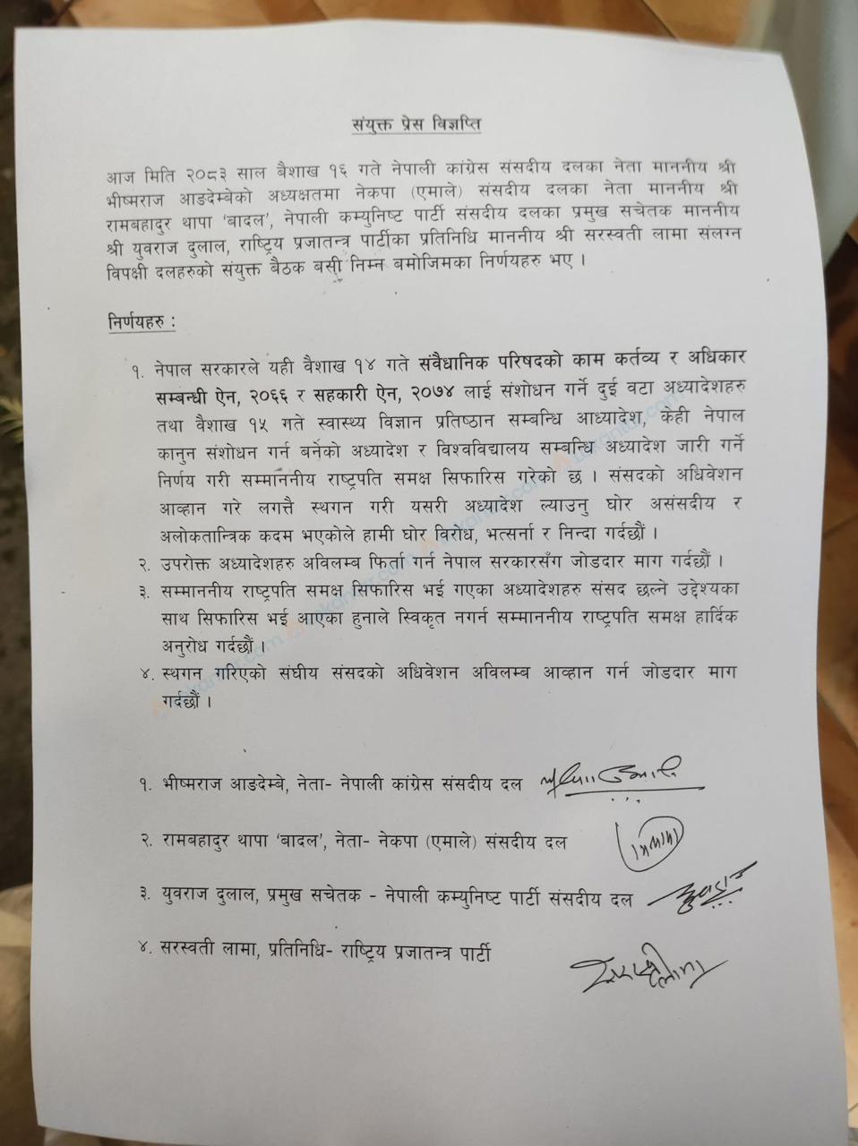 चार विपक्षी दलहरूद्वारा जारी संयुक्त प्रेस विज्ञप्तिमा वैशाख १४ र १५ गते सिफारिस गरिएका आधा दर्जन अध्यादेशहरू फिर्ता लिन जोडदार माग गरिएको छ । विशेषगरी संवैधानिक परिषद् (काम, कर्तव्य र अधिकार) सम्बन्धी ऐन र सहकारी ऐनमा गर्न खोजिएको संशोधनले राज्यका संवैधानिक निकाय र जनचासोका विषयमा सरकारी हस्तक्षेप बढ्ने उनीहरूको दाबी छ । संसदको बैठक बोलाउनुको सट्टा अध्यादेशको सहारा लिनुले सरकारको नियतमाथि गम्भीर प्रश्न उठेको विपक्षीको तर्क छ ।
