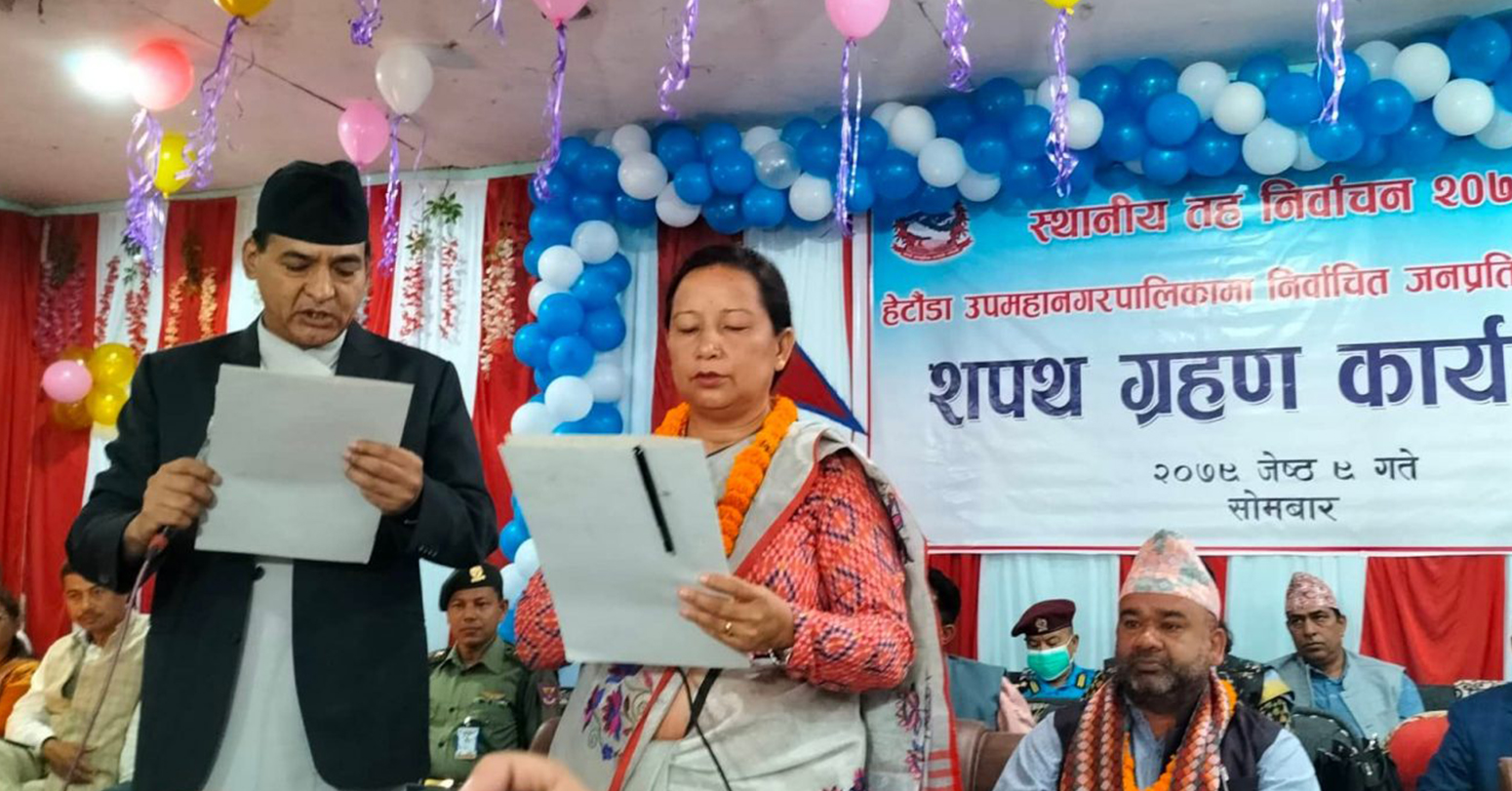 हेटौँडा उपमहानगरपालिकाकी नवनिर्वाचित मेयर मीनाकुमारी लामाले आफ्नो प्रतिबद्धतालाई कार्यान्वयनको तहमा अघि बढाएकी छिन् । शपथग्रहणलगत्तै पदभार सम्हालेकी लामाले चुनावी प्रचारप्रसारको क्रममा गठबन्धनबाट संयुक्त समेटिएको प्रतिबद्धतालाई पहिलो निर्णयमार्फत अघि बढाएकी हुन् ।