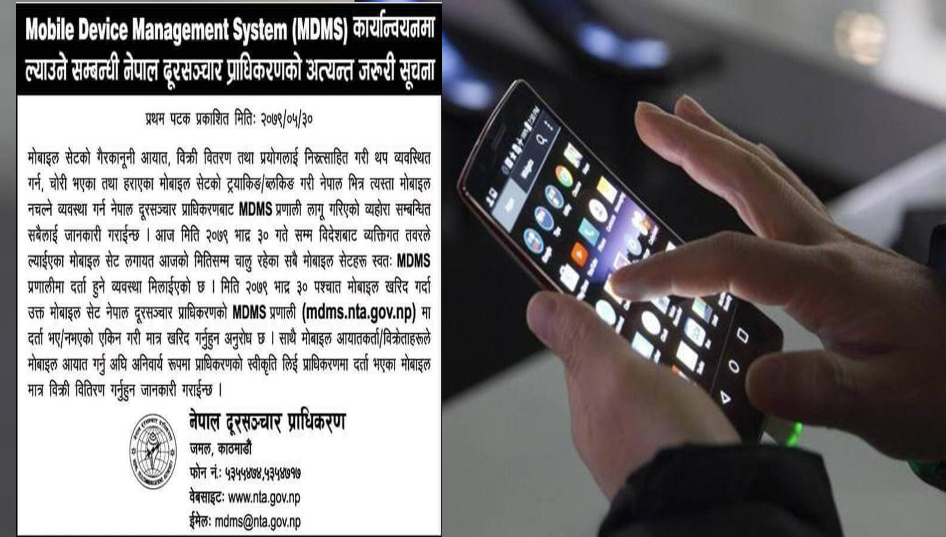 नेपाल दुरसञ्चार पाधिकरणले ३० भदौसम्म नेपालमा चलाइरहेका सबै मोबाइल सेट स्वतः एमडिएमएस प्रणालीमा दर्ता हुने व्यवस्था मिएको जनाएको छ । ३० भदौ पश्चात विदेशबाट व्यक्तिगत तवरले ल्याएका मोबाइल सेटलाई अनिवार्य रुपमा एमडिएमएस प्रविधिमा दर्ता गर्नु पर्ने अर्थात एमडिएमएसमा तर्दा नभएका मोबाइल सेटले माम गर्ने छैनन् ।