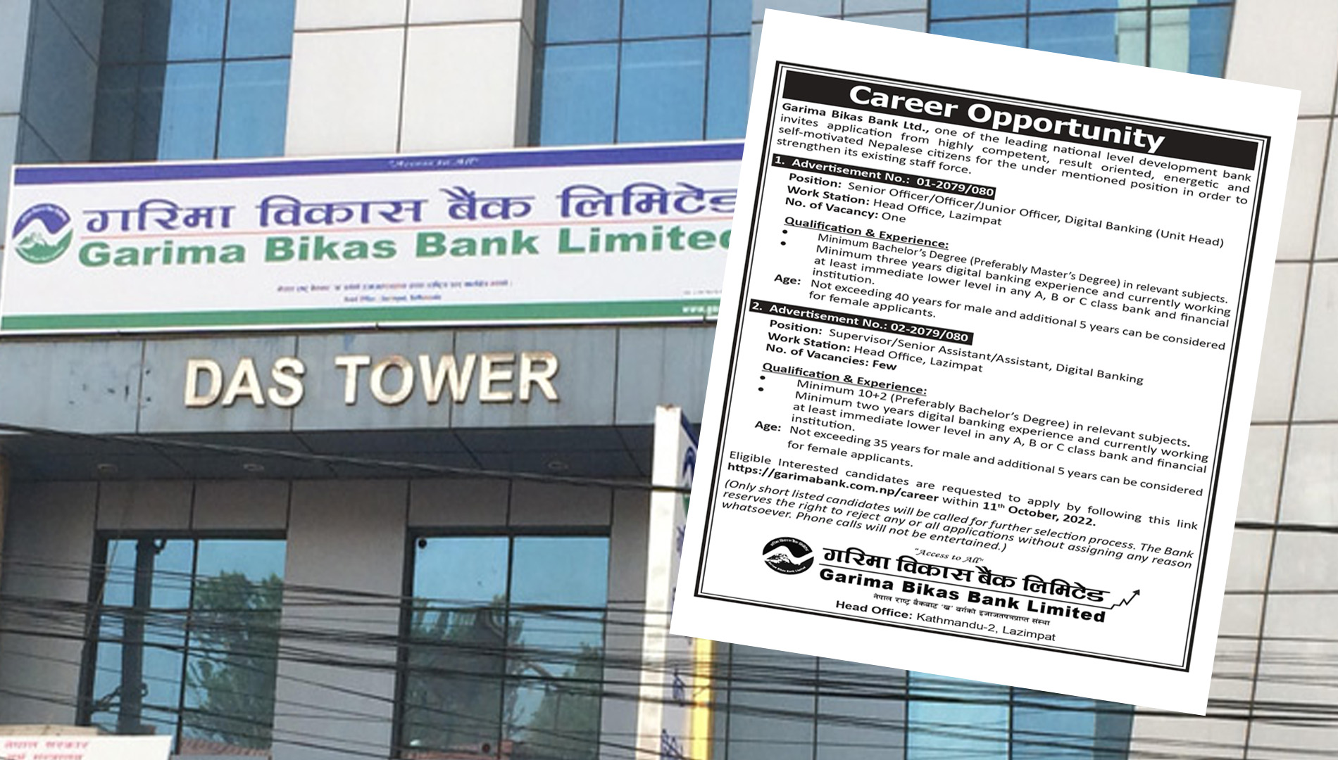 इच्छुक उम्मेदवारले बैंकको वेबसाइट https://www.garimabank.com.np/ मार्फत आवेदन दिन सक्नेछन् ।