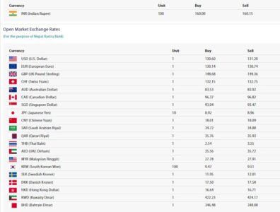 त्यसैगरी, अमेरिकी डलर एकको नेपाली खरिद दर १३० रुपैयाँ ६० पैसा र बिक्री दर १३१ रुपैयाँ २० पैसा रहेको छ भने युरो एकको नेपाली खरिद दर १३० रुपैयाँ १३ पैसा र बिक्री दर १३० रुपैयाँ ७४ पैसा रहेको छ ।